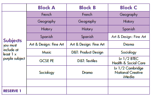 ONE of your preferences must be either French, Geography, History or Spanish (highlighted purple on the table)